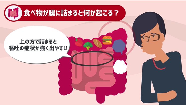 大腸よりも小腸寄りの、より上の方で詰まると嘔吐の症状が強く出やすいとされていますね。
