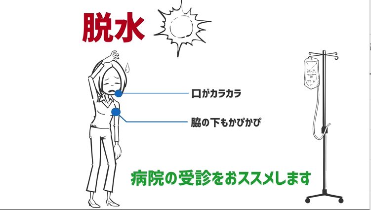 普段は人間って口の中も湿っているし、わきの下も湿っているものなんですけど、脱水の状態になると口がカラカラになって、脇の下もかぴかぴになってしまいます。