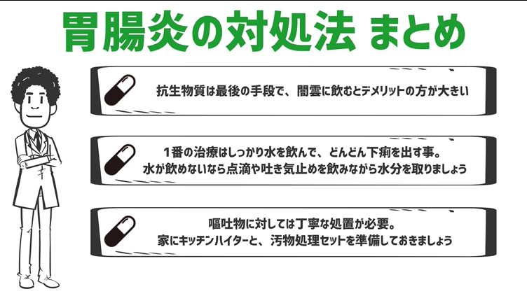 胃腸炎の1番根本的な治し方としては、しっかりいつもより多くの水を飲んで、どんどん下痢をしてウイルスを体の外に出す事です。これが1番の治療です。