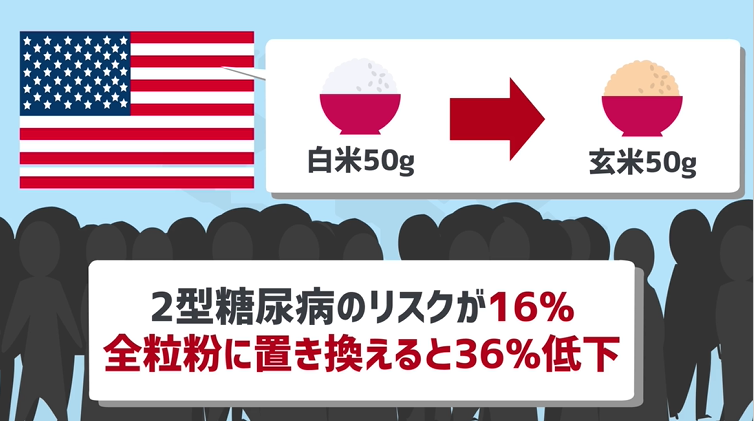 例えばアメリカでおよそ20万人を対象をおこなわれた研究では、白米の1日の摂取量50g分を玄米に置き換えると、2型糖尿病のリスクが16%、全粒粉に置き換えると36%低下したというデータもあります。