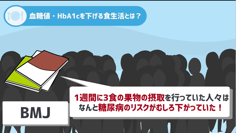 BMJという雑誌に投稿された日本人の研究者が行った約19万人を対象にした研究によると、1週間に3食の果物の摂取を行っていた人々はなんと糖尿病のリスクがむしろ下がっていたというデータがあります。