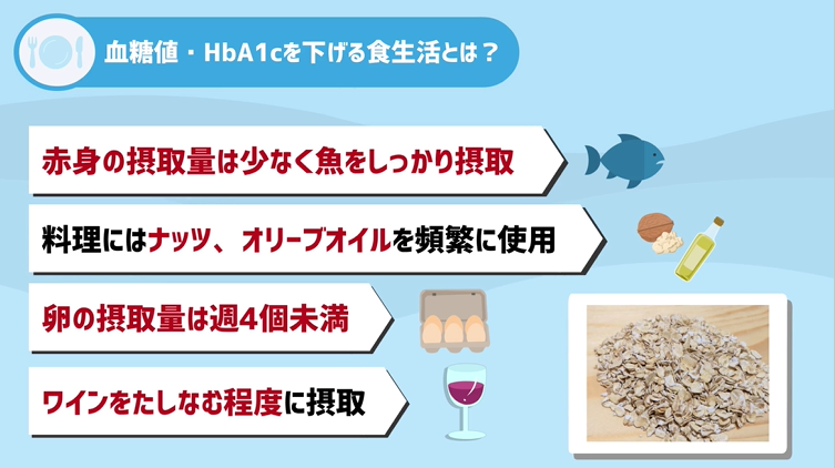このような食生活を意識すると、糖尿病のリスクを下げる効果が期待できます。是非普段の食事に取り入れていきましょう。