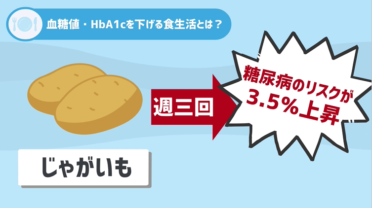 じゃがいもに関しては、例えば週3回じゃがいもを食べる量を増やした所糖尿病のリスクが3.5%上昇したというデータもあり、逆に糖尿病のリスクを上げる可能性もあります。