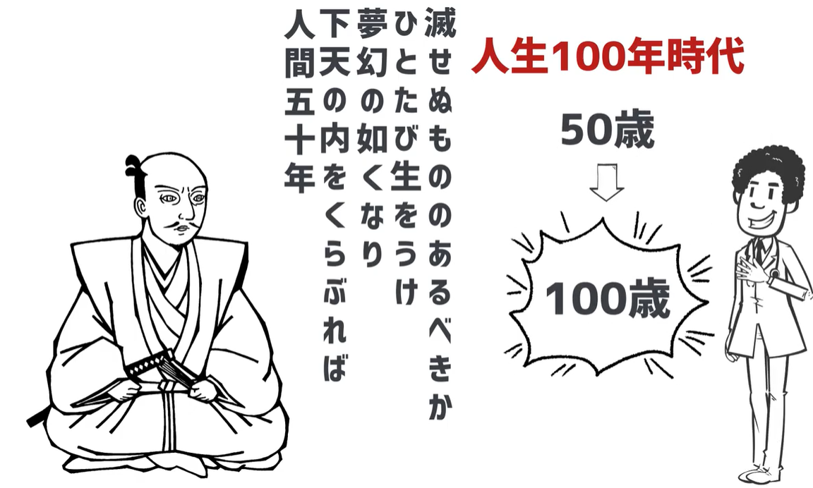 はるか昔、江戸時代くらいには人間の寿命は織田信長が吟じた歌の通り50年くらいでした。ところが医学の凄まじい進歩によりどんどん寿命が延びていき、今後は人生100年時代なんて言われてるんですよね。