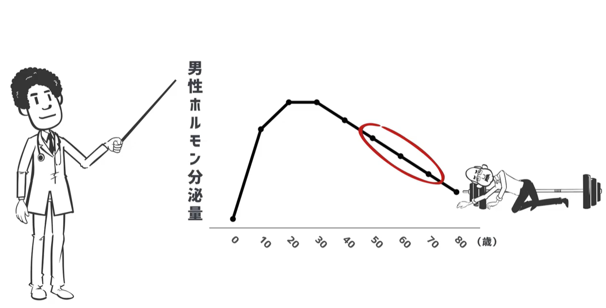 そして20代前半くらいまでは増え続けていきますが、残念ながらそこをピークにじわじわ減少していきます。そして45歳くらいになるとかなりのテストステロンの量が減っていて、筋肉量が自分でわかるくらい減ってきてしまうんです。