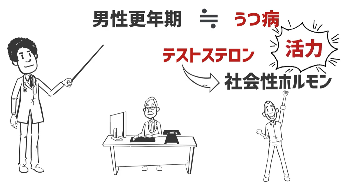 さらに、例えば「急に営業の仕事から中間管理職に異動させられて仕事が全然うまくいかなくてストレスが溜まってしまったり、がむしゃらに仕事を頑張ってきた人がようやく定年退職をしてほっと一息ついたところで何にもやることがなくて刺激がなかった。」こういった事が原因でテストステロンが下がってしまうっていうこともあります。