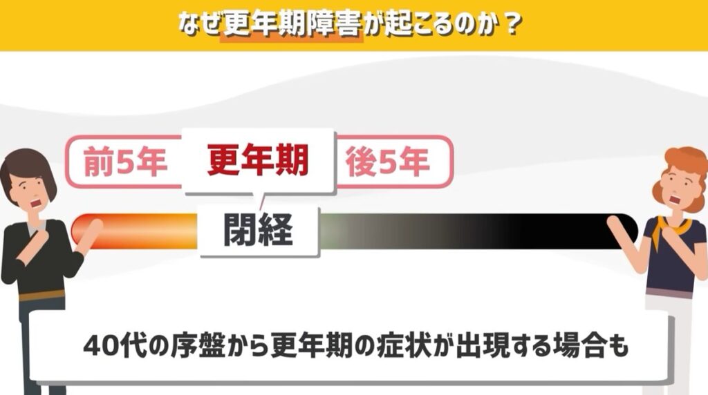 要するに、それぞれの女性の閉経の時期によって、更年期もずれていきますし、早ければ40代から更年期の症状が出現する場合があります。
