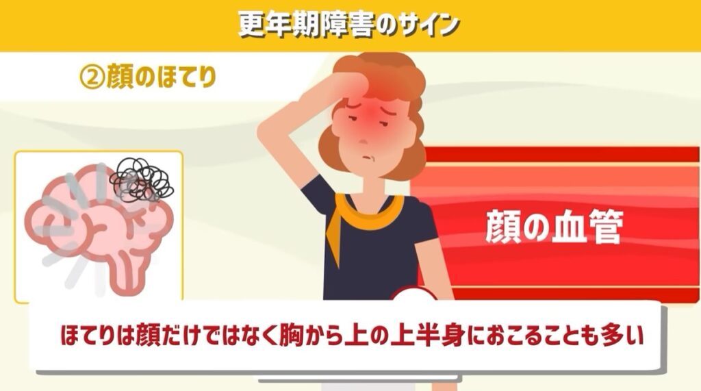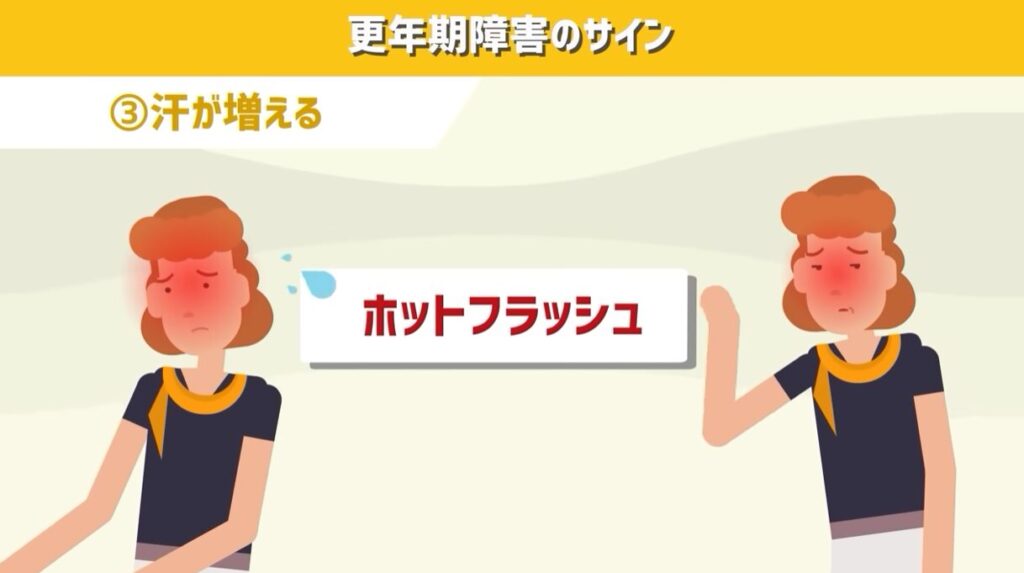 先ほど紹介した顔のほてりと合わせて、これらの症状を「ホットフラッシュ」と呼ぶこともあります。