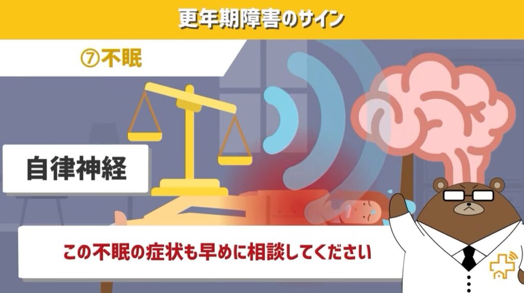 先ほど紹介したほてりや汗の量が増えることで、寝ずらくなってしまう場合もありますし、自律神経が不安定になることで、睡眠をコントロールしている部分の脳に影響が出るという説もあります。