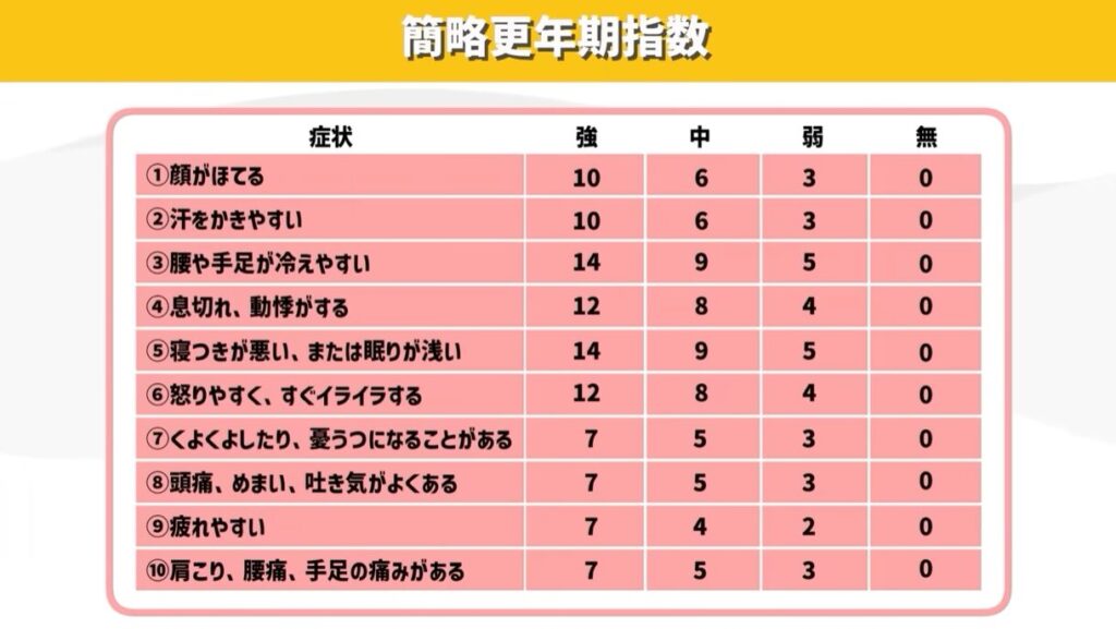 シートはこんな感じ。これは「簡略更年期指数」というもの。チェックをつけて合計点数を計算することで、大まかな自分の更年期障害の目安がわかるものになっています。