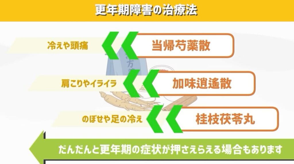 冷えや頭痛に効果がある当帰芍薬散、肩こりやイライラに効く加味逍遙散、のぼせや足の冷えに効く桂枝茯苓丸などの漢方薬を飲むことで、だんだんと症状が押さえらえる場合もあります。