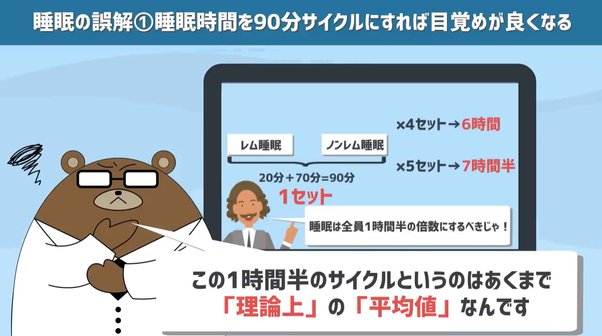 そして人間の睡眠の周期はノンレム睡眠70分+レム睡眠20分=90分。この1時間半で1セットになっている。