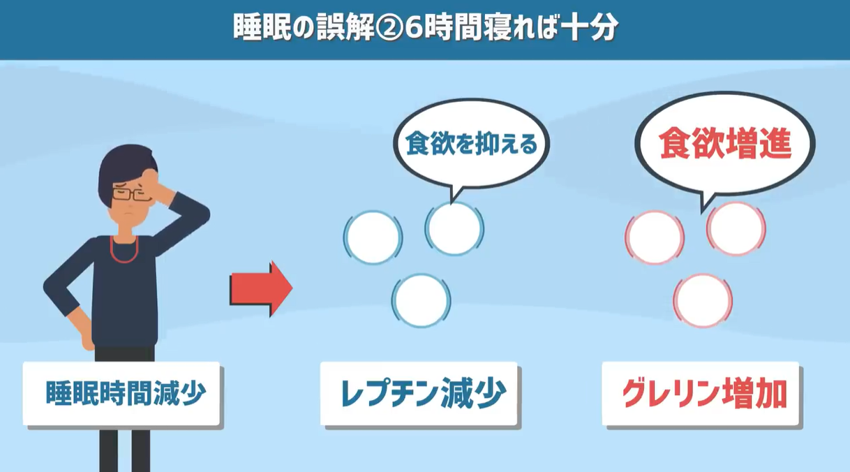 なぜ睡眠時間が減ると良くないのか、原理の話で言えば睡眠時間が短くなると、食欲を抑えるホルモンである「レプチン」の分泌量が少なくなり、食欲を増進させる「グレリン」の分泌量が多くなるとされています。