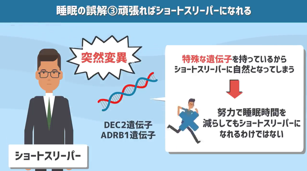 要するに特殊な遺伝子を持っているからショートスリーパーに自然となってしまうのであって、自分の努力で睡眠時間を減らしてもそれに体が慣れたり、追いついてきたりするわけではないという事です。