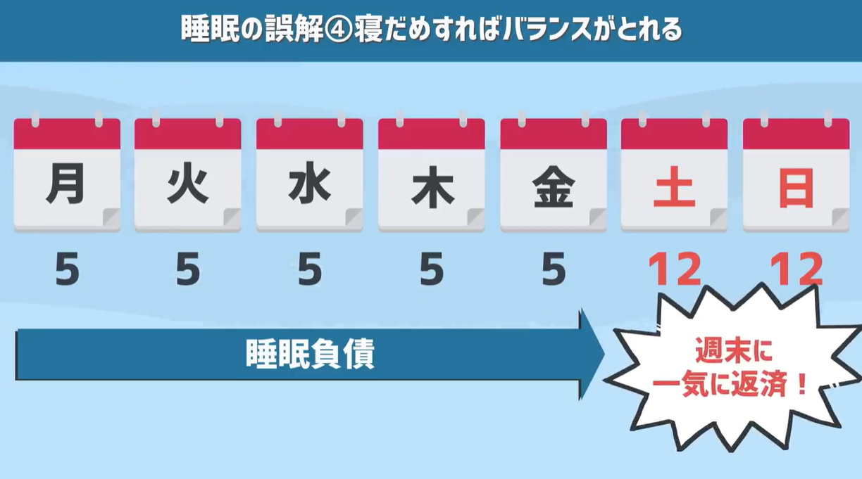しかし、「平日に作った睡眠負債を寝だめで±0に、チャラにできる」この考え方は間違っています。