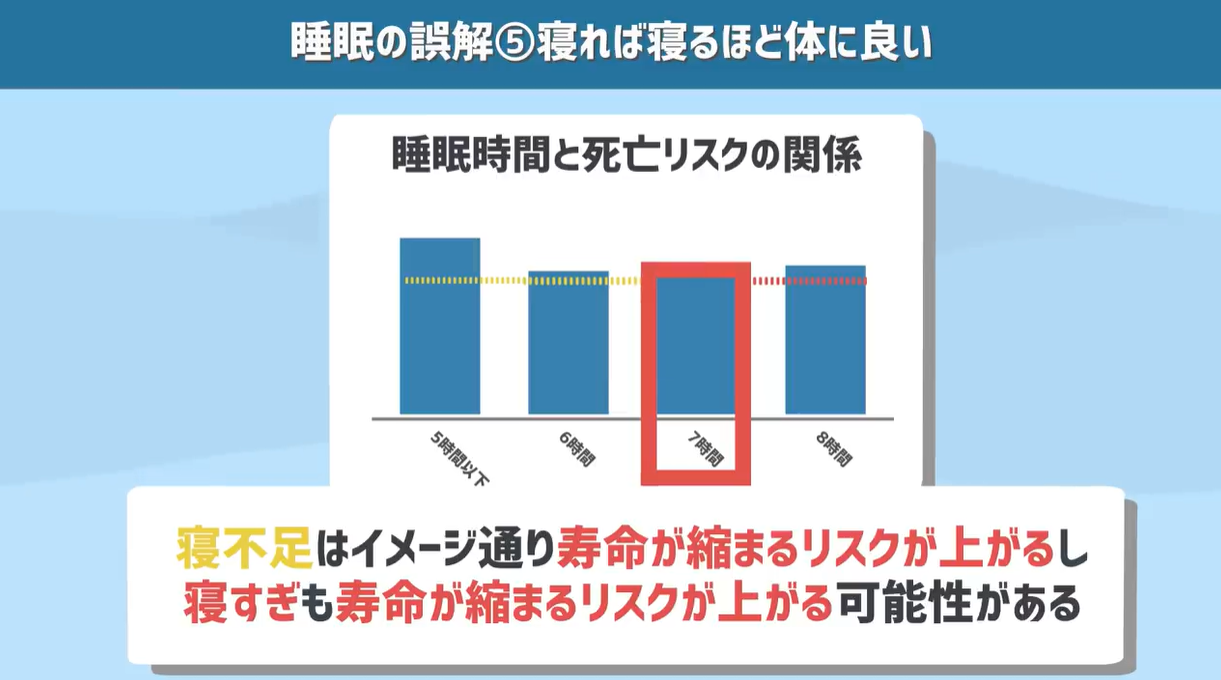 約10万人の日本人を対象にした研究では、8時間以上睡眠をとっている人は、7時間睡眠の人より寿命が短かったというデータが存在します。