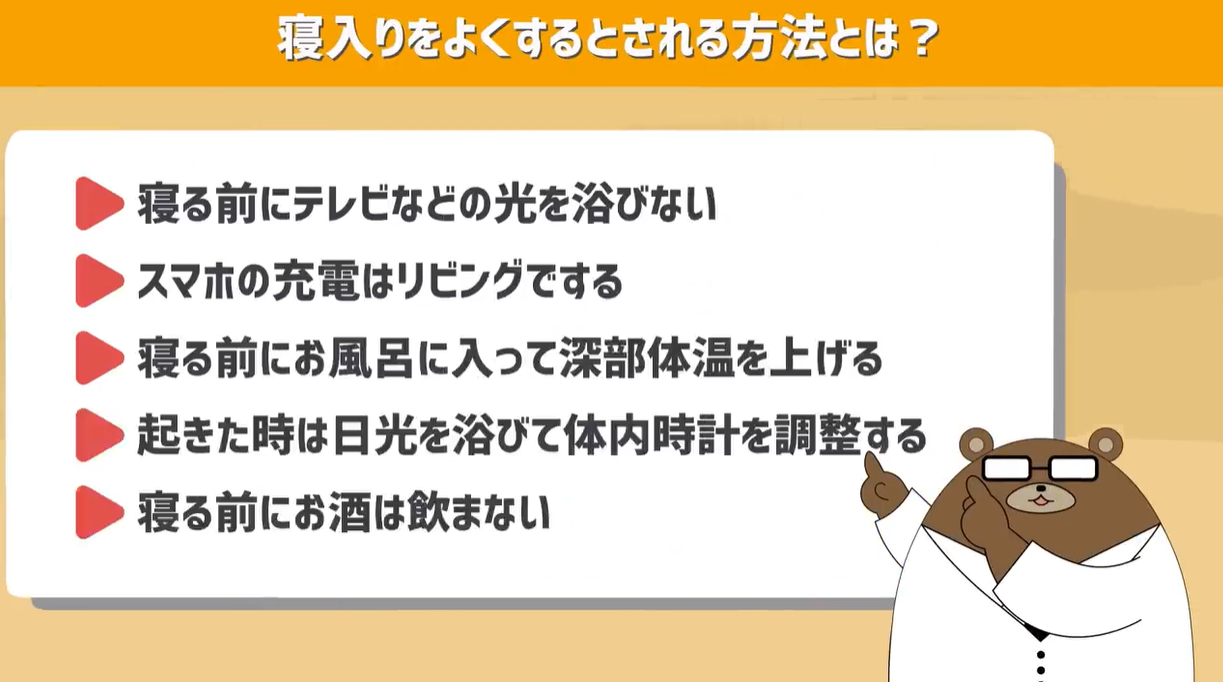寝る1.5時間前くらいにお風呂にゆっくり入り深部体温を上げておく。こうすることで自然と体温が下がり寝入りの時に眠気が気やすくなるという場合もあります。