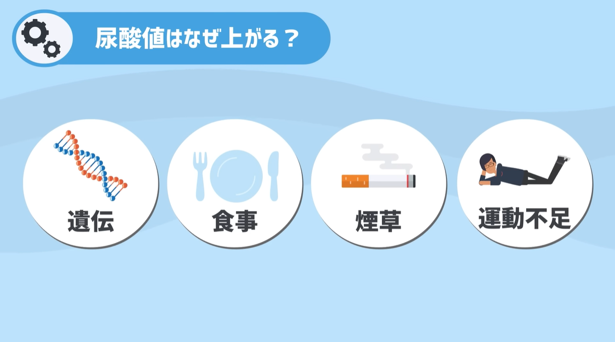 そのほか、たばこを吸ったり運動不足など、さまざまな影響が絡まり合って尿酸値は上昇していくんですね。