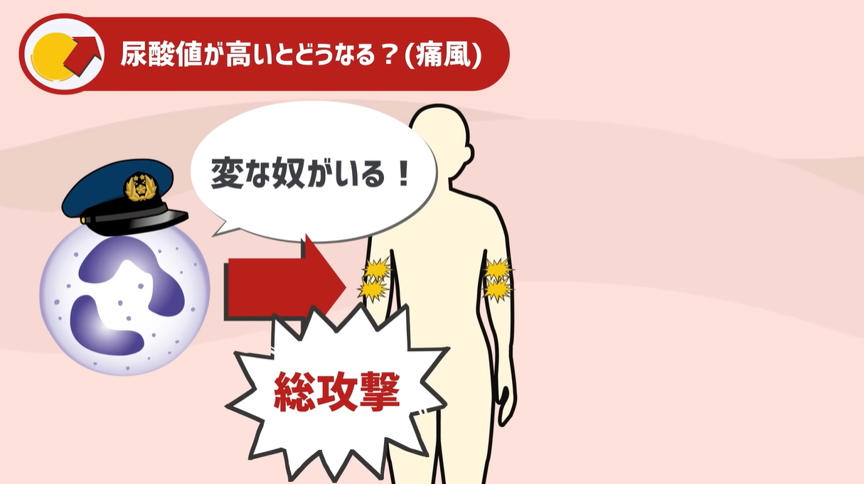 尿酸が結晶化して変形してしまうと、人間の体の中では見られない変なやつがいるという異物、すなわち敵として扱われてしまい、体の警察の役割を果たしている白血球の総攻撃を受けるんです。