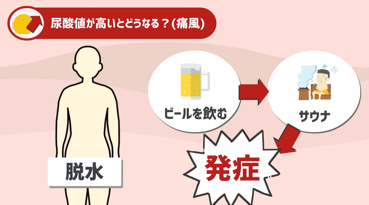 例えば、ビールを飲んだ後に水も飲まずにサウナに入って汗をいっぱいかく、こんな習慣がある人は痛風がサウナの中で起きてしまってもおかしくありません。