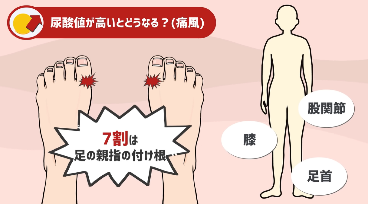 高い尿酸値の影響で起きるもので最も有名なのが皆さんご存知の痛風です。