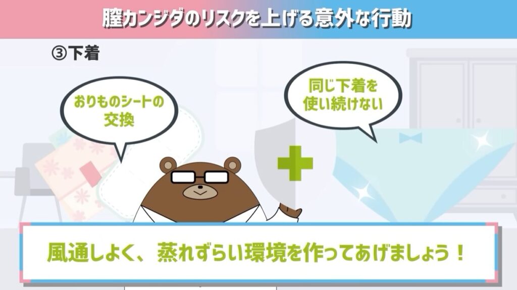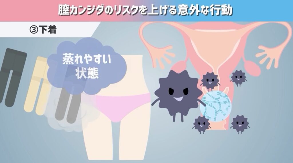 他にも、お風呂上がりに拭きが甘く、水分が残った状態で下着をつけて、そのまま寝てしまう。こんな場合もカンジダが喜んでしまいます。お風呂上がりに保湿のクリームを塗ったりするのは全然構いませんが、しっかりと乾燥をさせて、水分を拭きとってから下着をつける。これを心がけてください。