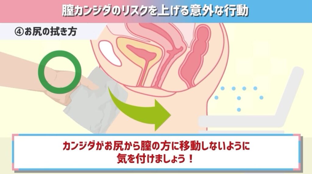 なのでもし、後ろから前にお尻を拭いてしまう習慣のある方、その過程でカンジダがトイレットペーパーを介して膣の方に移動してしまうことがあるんです。