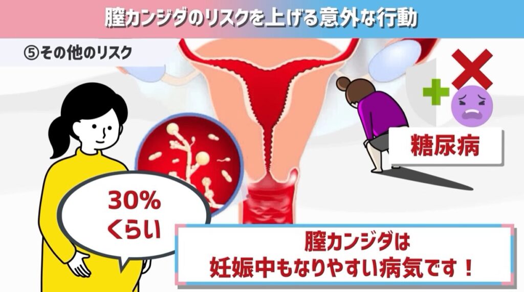 まず、糖尿病の人は免疫機能も落ちやすいので、膣カンジダになりやすいですし、女性の膣の中にカンジダがいる可能性は、普段は15%くらいなんですが、妊婦さんは30%くらいと言われていて、妊娠中もなりやすい病気です。