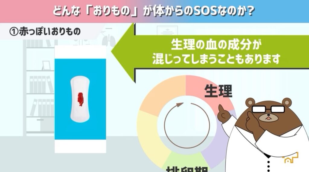 赤いおりものは生理の周期のものなのかどうかで、まずは怪しいサインを見分けるんですね。もし生理によらずに赤みがかったおりものが続く場合は一度婦人科を受診した方が良いでしょう。