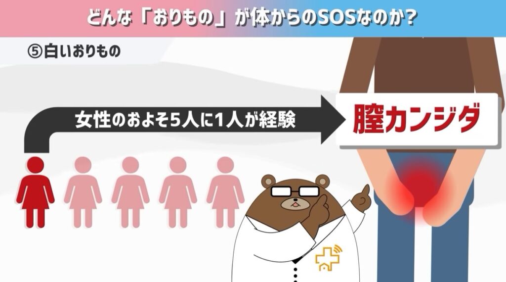 病院で検査をすることもありますが、膣カンジダの場合は本当にこのヨーグルト状のどろっとしたおりものが非常に特徴で、有名です。まだ起こったことがない人も膣カンジダは女性の5人に1人が経験しているという非常にありふれた病気なので、是非覚えておいてください。
